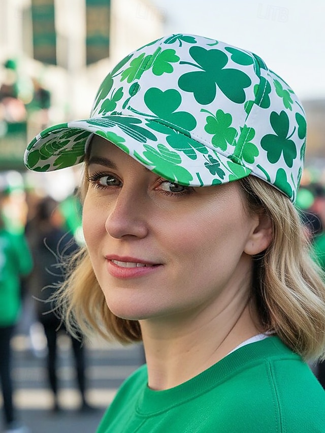 ユニセックスの聖パトリックの日のシャムロックプリントの野球帽、ポリエステルプリント生地、複数のクローバー柄、男性と女性のためのカジュアルな祭りスタイルの帽子、パレード、パーティー、屋外のお祝い用ウェア #17165168