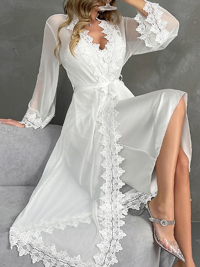 女性用 ローブ あたたか ファッション カジュアル ピュアカラー サテンシルキーパジャマ レース ドレス 家 ベッドサイド 長袖 クルーネック ホワイト 夏 春 レギュラー #17180020