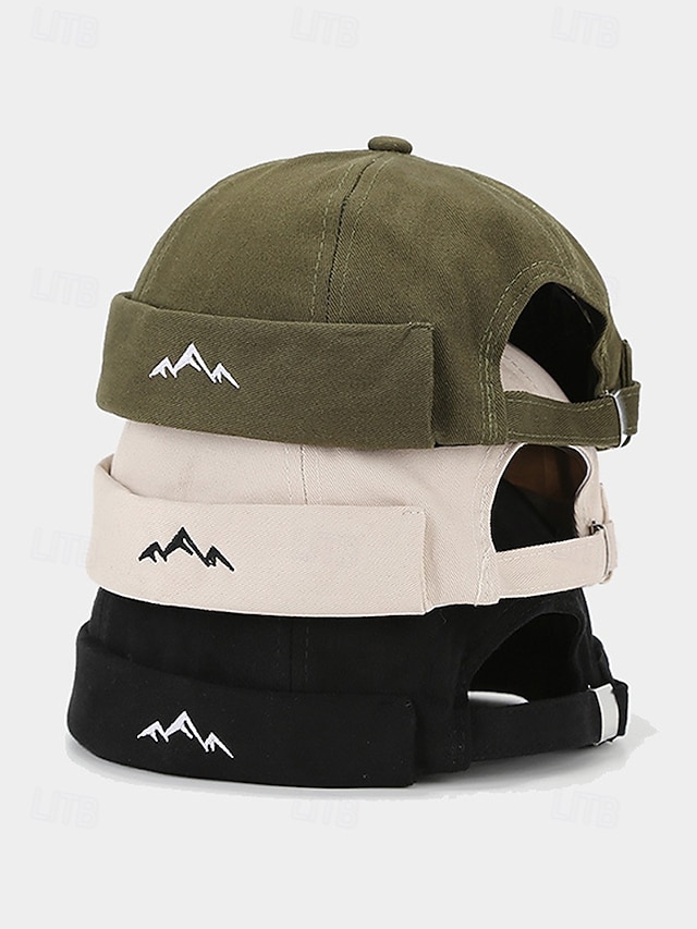 メンズポリエステル製ドッカーハット。つばのない調節可能なキャップで、山のモチーフが刺繍されています。複数のカラー展開で、旅行、アウトドアスポーツ、普段着、バケーションスタイルに最適です。 #17348819