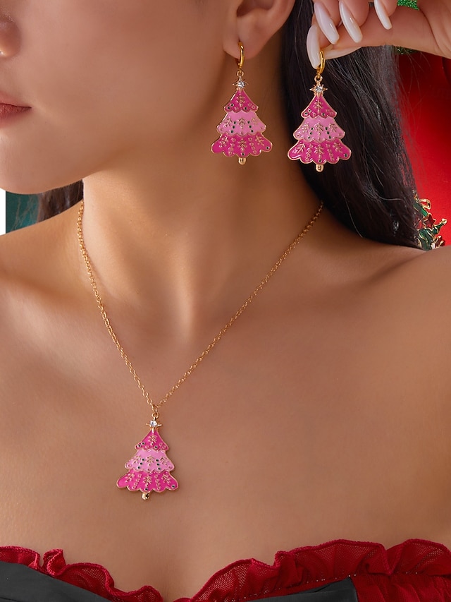女性用ピンクのクリスマスツリージュエリーセット、ゴールドトーンのエナメルネックレスとイヤリング、冬のパーティーやギフトに最適なホリデーアクセサリー &衣装 #18588473