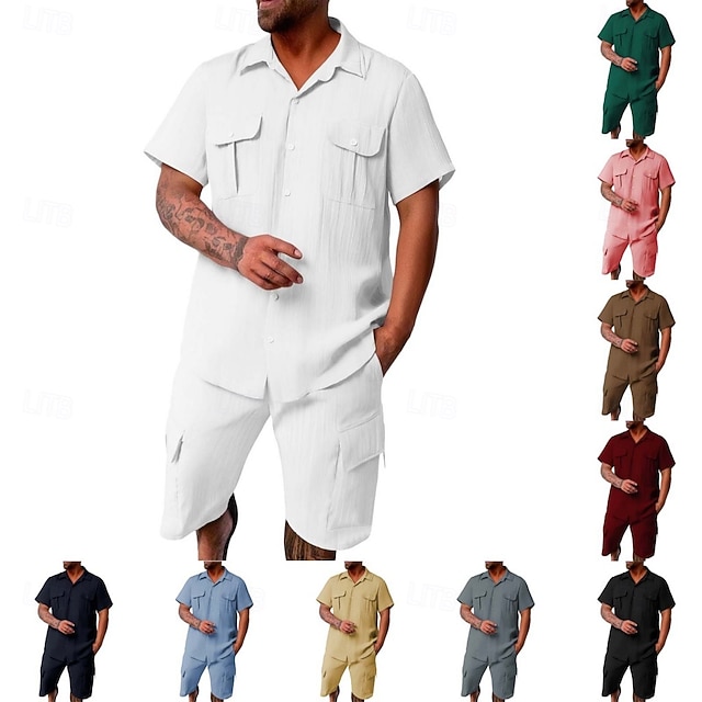 男性用 シャツ シャツセット カジュアルシャツ ビーチシャツ ボタンアップシャツ グリーン 半袖 ライン/ウェイブ ラペル カジュアル 日常 ジャカード 衣類 ファッション カジュアル 快適