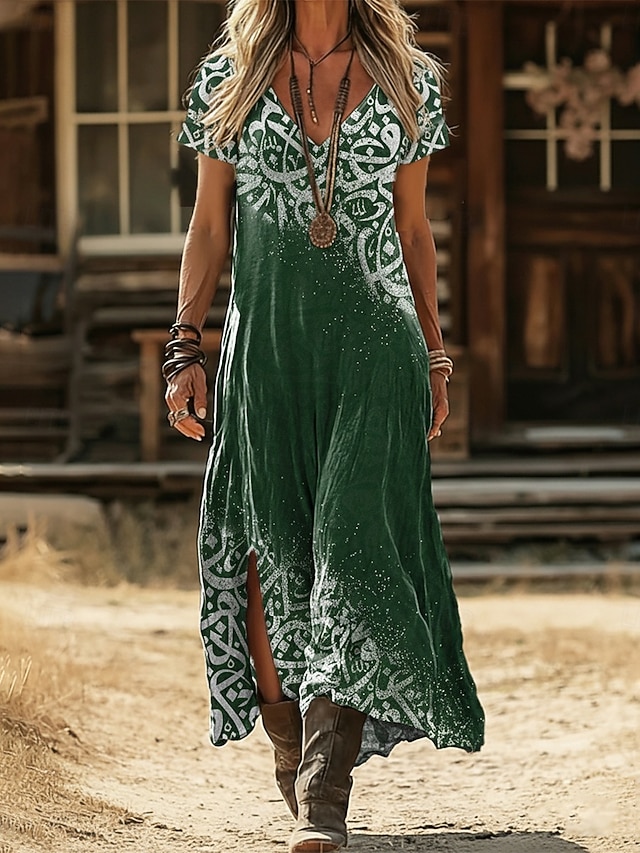 女性用 マキシドレス 自由奔放に生きるドレス カジュアルドレス A ラインドレス プリントドレス ヴィンテージ アウトドア バケーション 週末 ルーズフィット グラフィック 半袖 Vネック ブラック イエロー ライトグリーン ピンク 夏 春 #18764008