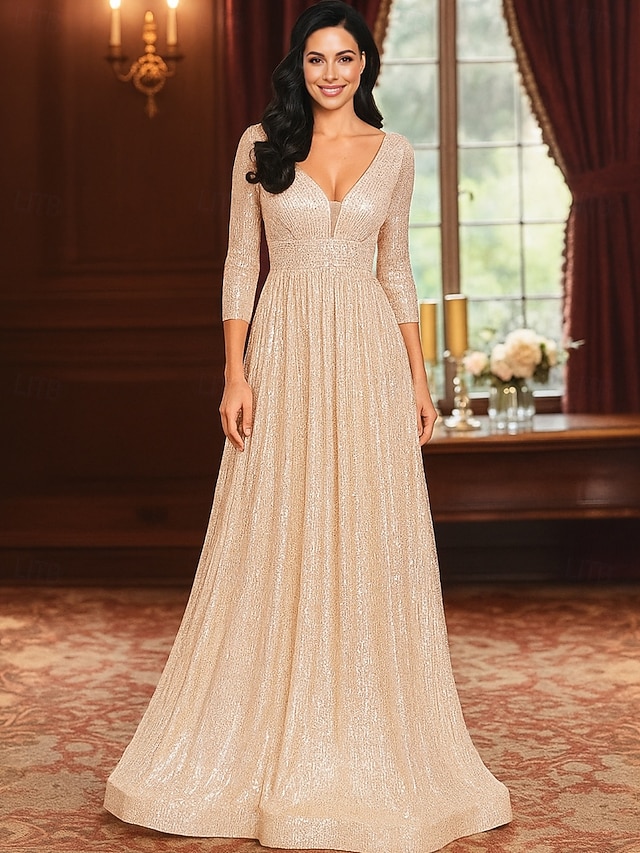 Aライン フロア丈 ウェディングゲストドレス フォーマルドレス イブニングガウン マダムドS 七分袖 Vネック エレガント パーティー 豪華 祝日 カクテルパーティー フォーマルイブニング チュール 〜と プリーツ スパンコール #19822357