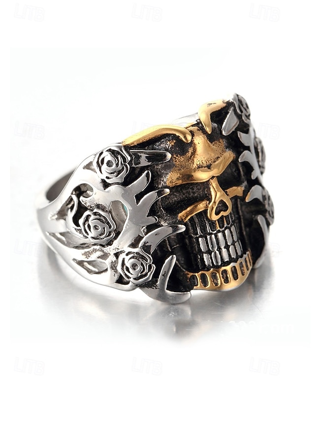 メンズ ステンレススチール ゴシック スカル リング、マルチサイズ バイカー パンク ステートメント バンド、花柄ディテール、カジュアルウェア、旅行、休暇、ハロウィン スタイリングに最適な大胆なファッション ジュエリー #14673375