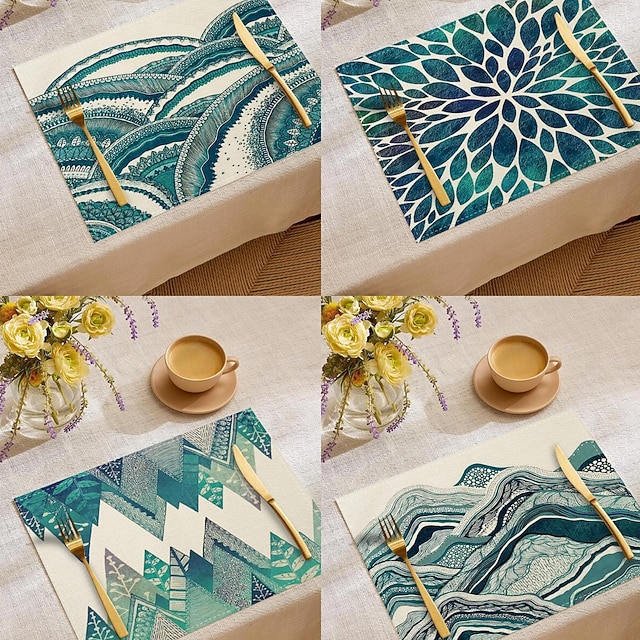 夏の海をイメージしたダイニングプレイスマット、ポリエステル100%の長方形テーブルマット、海の幾何学模様デザイン、洗濯機洗い可能、耐熱性、耐久性のあるテーブルプロテクター、モダンなホームキッチン #16331961