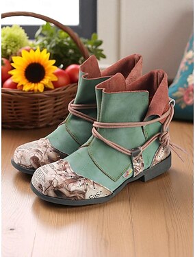 女性用アーティスティックパッチワークブーツ – クリエイティブなストリートウェア、都会のガーデニング、週末の旅行に最適なカラフルなレースアップアンクルブーツ