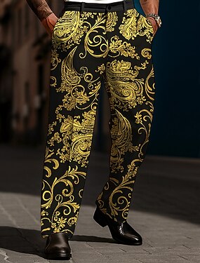 男性用 ペーズリー フラワープリント エスニック スーツ ズボン スーツパンツ ミディアムウエスト ヴィンテージレトロ カジュアル 祝日 サイドポケット付きリラックスフィットフラットフロントドレスパンツ 春 秋 3Dプリント ブラック ホワイト