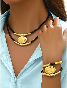 女性用ボヘミアンレザーとメタルのステートメントネックレス&ブレスレットセット。調節可能。ゴールドとシルバーからお選びいただけます。カジュアルにもイブニングウェアにも最適です。