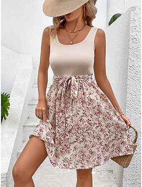 女性用 ひざ丈ドレス 花柄ドレス エレガント アウトドア ビーチ バケーション レギュラー 頭が変な花 ノースリーブ クルーネック フラワー ブラック ダークレッド ピンク 春