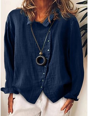 女性用 シャツ ブラウス フェイクコットンリネン パッチワーク ボタン 純色 ストリートファッション スタイリッシュ クラシック 長袖 シャツカラー レギュラートップス 日常 祝日 お出かけ ブルー ホワイト イエロー ブラウン グリーン 夏 春