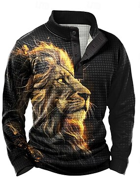 男性用 ライオン ワッフル スウェットシャツ 日常 クラシック カジュアル スタンド アウトドア 家 ワーク 贈り物 ブラック ボタン 秋 冬 デザイナー S M L XL XXL XXXL