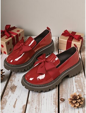ウィメンズ バーガンディ パテントレザー スリップオン ローファー ボウ付き - カジュアルな外出、日常の着用、クリスマスホリデーに最適なチャンキープラットフォームシューズ