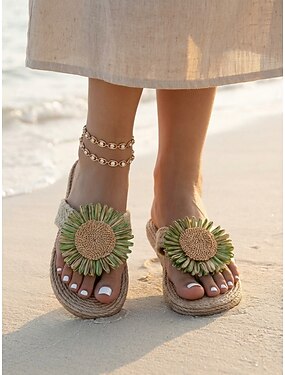 女性用鮮やかなオレンジ色のひまわり柄ビーチサンダル - 夏の休暇や南国の島への旅行にぴったりの、花柄のアクセントがあしらわれたロマンチックでボヘミアンな編み込みストローサンダル &海辺のパーティー