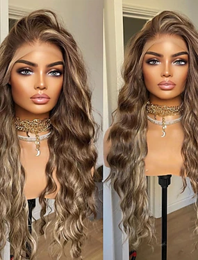 未処理バージンヘア 13x4 レースフロントウィッグ フリーパート ブラジル髪 ウェーブのかかったマルチカラーウィッグ 130% 150% 密度ハイライト/バレイヤージュヘア 100% バージンヘア 事前に摘み取られた女性用 ロング人毛レース