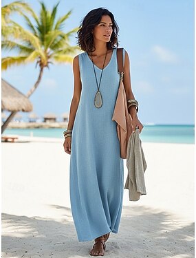 女性用リネン風フェイクコットンリネンマキシドレスサンドレスAラインドレスバケーションカジュアルアウトドア外出用レギュラーフィット無地ノースリーブVネック青夏春