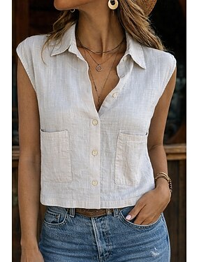 女性用 シャツ コットンリネンシャツ サマーシャツ ボタンアップシャツ ポケット 平織り 旅行度假风 ファッション カジュアル ノースリーブ 折襟 クロップトップ 日常 ビーチ 祝日 アプリコット 夏 春 秋