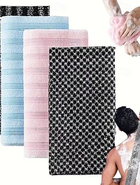 4枚のバス用角質除去タオル、長めの両面ポリエステル混紡ストライプ柄生地、手洗いまたは専門業者によるドライクリーニング