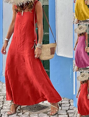 女性用 ロングドレス マキシドレス マキシドレス フェイクコットンリネン シフトドレス サンドレス カジュアルドレス ファッション アウトドア パーティー 祝日 レギュラー 平織り 半袖 キャミソール イエロー ルビーレッド グリーン 夏