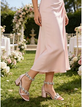 ローブロックヒール、クリスタルフローラルストラップ、エレガントで快適なウェディングパーティーシューズのシャンパンブライズメイドサンダル