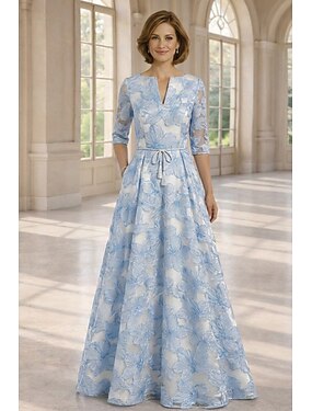 Aライン フロア丈 ウェディングゲストドレス フォーマルドレス フレアワンピース マダムドS ハーフスリーブ Vネック ボートネック エレガント シンプル フォーマル オーガンザ ジャカード 〜と リボン