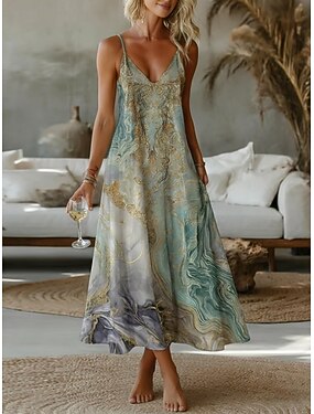 女性用 マキシドレス カジュアルドレス スリップドレス ファッション ベーシック 近代の 日常 アウトドア ビーチ ルーズフィット マーブルプリント ノースリーブ Vネック ブルー 夏 春
