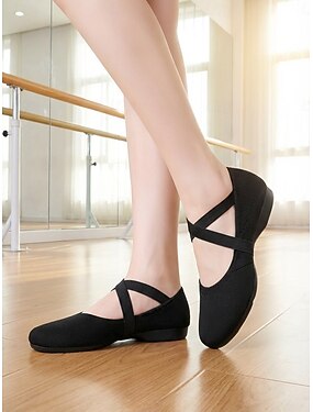 女性用ブラックストレッチダンス練習用シューズ、クロスストラップソフトソールバレエフラット、ダンサーやスタジオリハーサル用の軽量トレーニングシューズ