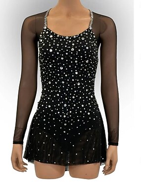 フィギュアスケートドレス レディース ガールズ アイススケートドレス ブラック オープンバック アシンメトリーヘム メッシュ 高弾性 トレーニング 競技 スケートウェア クラシック クリスタル/ラインストーン ロングスリーブ アイススケート フィギュア