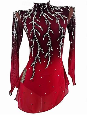 フィギュアスケート ドレス 女性用 女の子 アイススケート ドレス バーガンディー パッチワーク 指穴付き メッシュ スパンデックス 伸縮性あり 訓練 レッスン用 プロフェッショナル スケートウェア 保温 クリスタル・ラインストーン 長袖 アイススケート フィギュアスケート
