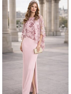 タイト/コラム ドレス フロア丈 ウェディングゲストドレス マダムドS 半袖 ボートネック エレガント シンプル きらきら&ピカピカ フォーマル 結婚式のゲスト 婚約パーティー シフォン ショール 〜と スパンコール 刺繍 フラワー