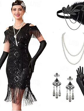 セット 20代の轟音 1920年代風 膝丈 ドレス フラップワンピース セット アクセサリー付き コールドショルダー 半袖 グレートギャツビー チャールストン スパンコール タッセル フェザー Vネック 仮装 女性用 カーニバル 新年 マスカレード パーティー イベント/パーティー レトロテーマパーティー 成人 1×ネックレス ドレス グローブ