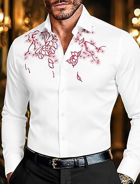 男性用 シャツ ドレスシャツ ボタンアップシャツ 刺繍シャツ 花 フォーマル 結婚式 ブラック ホワイト 長袖 ラペル 夏 春 衣類 刺繍