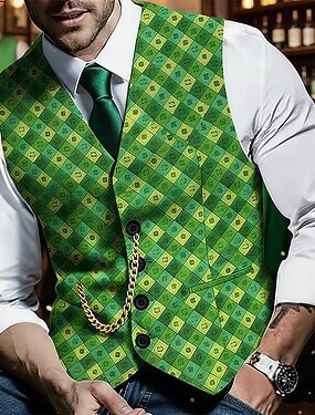 男性用 ベスト チョッキ ジレ アウトドア 聖パトリックの日 ファッション ストリートファッション 春 秋 ボタン コットン 通気性 グラフィック 幾何学模様 シングルブレスト Vネック レギュラー グリーン ベスト