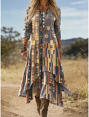 ウィメンズ ミディ ドレス ボヘミアン シフト ドレス バケーション パーティー カジュアル デイリー ホリデー レギュラー フィット グラフィック 幾何学模様 ロングスリーブ クルーネック Vネック ブルー イエロー パープル グリーン サマー スプリング フォール