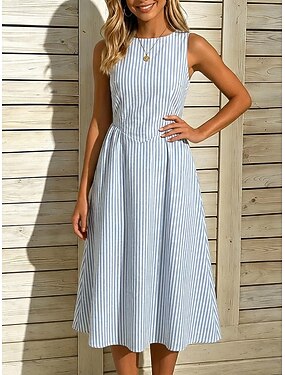 女性用 ミディドレス カジュアルドレス ストライプ柄のドレス A ラインドレス エレガント ファッション 日常 バケーション レギュラー ストライプ ノースリーブ クルーネック ブルー ブラック イエロー ローズレッド 夏 春