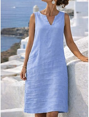 女性用 ひざ丈ドレス コットンリネンドレス シフトドレス サンドレス カジュアルドレス ベーシック 日常 バケーション お出かけ レギュラー ピュアカラー ノースリーブ Vネック スプリットネック ブルー イエロー ピンク グリーン 夏 春 秋