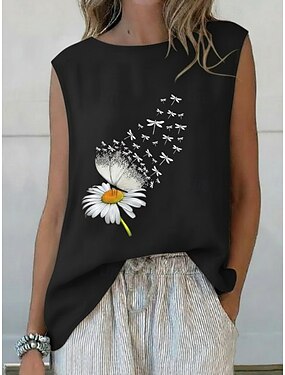 女性用 夏のトップス ブラウス ノースリーブシャツ プリント フラワー 日常 スタイリッシュ クラシック ノースリーブ クルーネック レギュラートップス 日常 祝日 お出かけ ブルー ブラック ホワイト ピンク 夏 春
