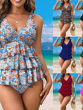 女性用タンキニ 2ピース水着 ルーシュ ショーツ お腹引き締め ハイウエスト スリム バックレス バケーション ビーチウェア フローラル グラフィック Vネック ノースリーブ 水着