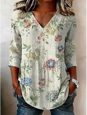 女性用 シャツ フラワー グラフィック ヴィンテージ スタイリッシュ Vネック ロングトップス カジュアル 日常 祝日 ブルー カーキ色 ライトブルー 夏 春