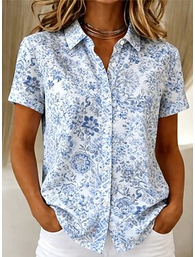 女性用 シャツ フェイクコットンリネン プリント フラワー スタイリッシュ 近代の 半袖 シャツカラー レギュラートップス 日常 祝日 ブルー ホワイト イエロー ピンク ルビーレッド 夏