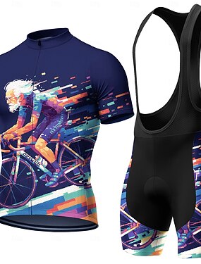 男性用 サイクリングジャージー ビブショーツ付きサイクリングジャージー 半袖 マウンテンサイクリング ロードバイク 夏 春 ダークネービー カートゥン 幾何学模様 バイク サンスクリーン UV耐性 3Dパッド サイクリング トレーナー スパンデックス ライクラ スポーツ 衣類