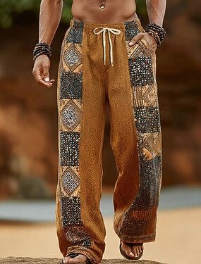 男性用 カラーブロック 幾何学模様 エスニック ズボン バギーパンツ カジュアルパンツ ミディアムウエスト ボヘミアン ヴィンテージレトロ 家 アウトドア バケーション 伸縮性のあるドローストリングウエスト ポケット付きリネン風パンツ 夏 春 3Dプリント ブラウン カーキ色