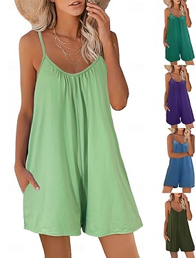女性用 ロンパース 活発的 純色 ノースリーブ バギーショーツ Uネック ポケット 日常 バケーション レギュラー ブルー ブラック ライトグリーン 夏