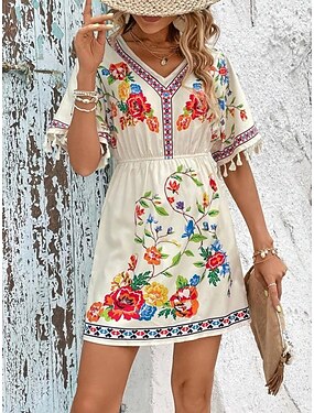 女性用 ミニドレス カジュアルドレス 民族衣装 サマードレス 自由奔放に生きるドレス ファッション カジュアル ボヘミアン フレアスリーブ 日常 バケーション 祝日 ルーズフィット フラワー プリント 七分袖 Vネック ホワイト 夏 春