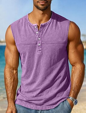 男性用 タンクトップ ベストトップ アンダーシャツ コットン100% アシッドウォッシュシャツ ノースリーブ ヘンリー 夏 平織り ファッション デザイナー ベーシック ポケット ボタン カジュアル バケーション ストリート ブルー ブラック ライトグリーン メンズトップTシャツ