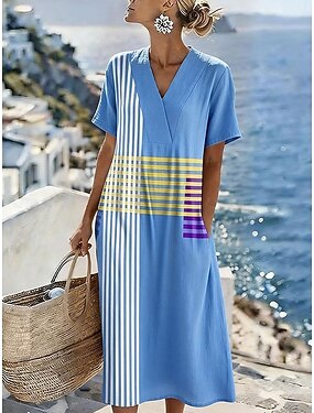 女性用 ミディドレス サンドレス カジュアルドレス 旅行度假风 カジュアル ビーチスタイル ビーチ パーティー レギュラー グラフィック 幾何学模様 抽象的 半袖 Vネック ブルー ピンク パープル 夏 春