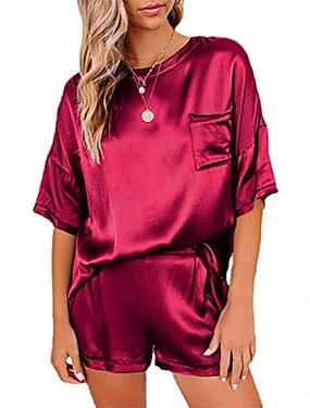 女性用 パジャマ ラウンジウェア カジュアル ピュアカラー ドローストリング 弾性ウエスト ショーツ 日常 家 半袖 クルーネック ブルー ホワイト ライトグリーン アーミーグリーン ルビーレッド 夏 春 ルーズフィット