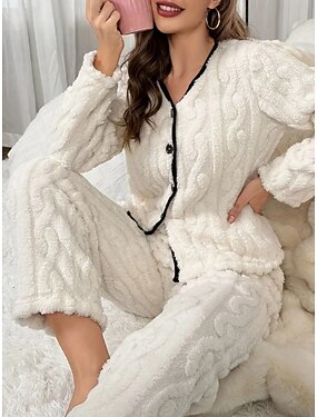 女性用 パジャマセット カジュアル コンフォートシューズ ピュアカラー 弾性ウエスト パンツ 家 日常 長袖 Vネック ホワイト ピンク 春 秋 冬 レギュラー