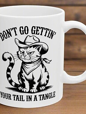 面白いギフトマグカップ。尻尾が絡まないように。面白い西部劇の猫。猫好きや西部劇ファンのための皮肉なユニークなコーヒーカップマグ。