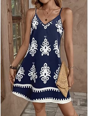 女性用 ミニドレス A ラインドレス スリップドレス オフショルダードレス 旅行度假风 カジュアル ビーチ お出かけ レギュラー グラフィック トライバル ノースリーブ Vネック 海軍 夏 春