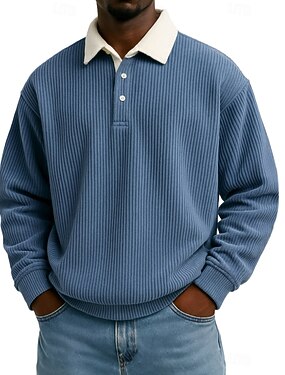 男性用 リブニットトップス テクスチャード加工 ストリート カジュアル ラペル 長袖 ベーシック 近代の 平織り ボタン 春 秋 オールシーズン スリムフィット ブルー ホワイト ネイビーブルー グレー リブニットトップス